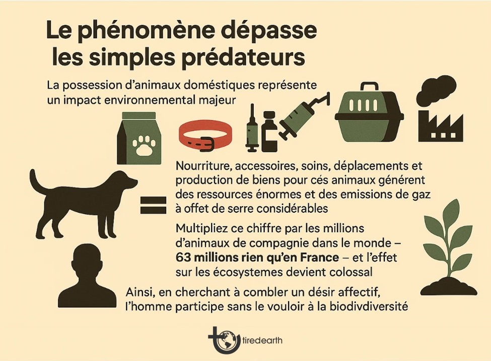Le phénomène dépasse les simples prédateurs. La possession d’animaux domestiques représente un impact environnemental majeur. Nourriture, accessoires, soins, déplacements et production de biens pour ces animaux génèrent des ressources énormes et des émissions de gaz à effet de serre considérables. Posséder un chien de taille moyenne équivaut, en termes d’impact environnemental, à rouler en SUV. Multipliez ce chiffre par les millions d’animaux de compagnie dans le monde — 63 millions rien qu’en France — et l’effet sur les écosystèmes devient colossal. Ainsi, en cherchant à combler un désir affectif, l’homme participe sans le vouloir à la destruction de la biodiversité [1].