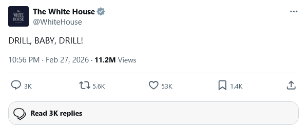 Le jour où les frappes ont commencé, le compte de la Maison-Blanche sur les réseaux sociaux a publié un unique message : "DRILL, BABY, DRILL !" Ce slogan, utilisé depuis longtemps par l'industrie pétrolière pour plaider en faveur de l'expansion des forages domestiques, apparaissait dans le contexte du bombardement d'un autre pays pour s'emparer de ses réserves de pétrole. Le message ne pouvait être plus clair : cette guerre est menée pour l'industrie pétrolière.