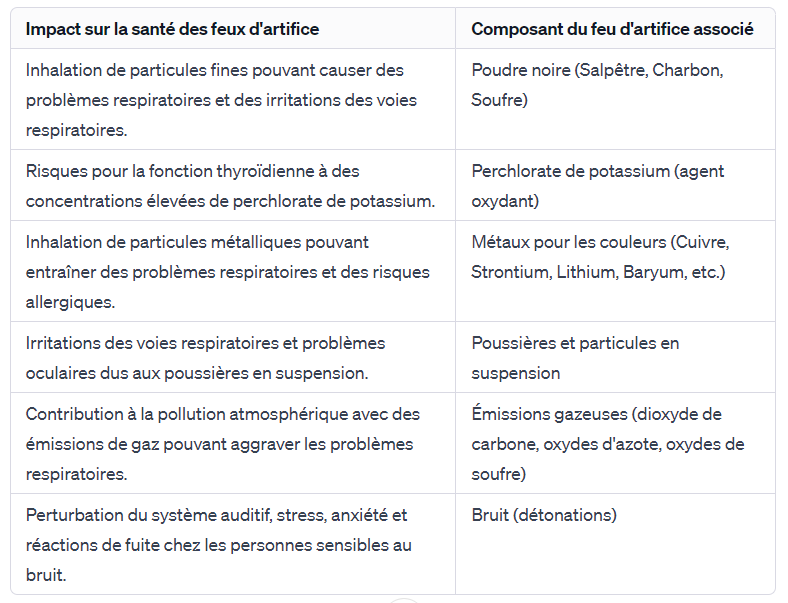 *Ces effets sur la santé peuvent varier selon plusieurs facteurs, notamment la proximité de l’exposition, la composition exacte des feux d’artifice utilisés et la sensibilité individuelle.