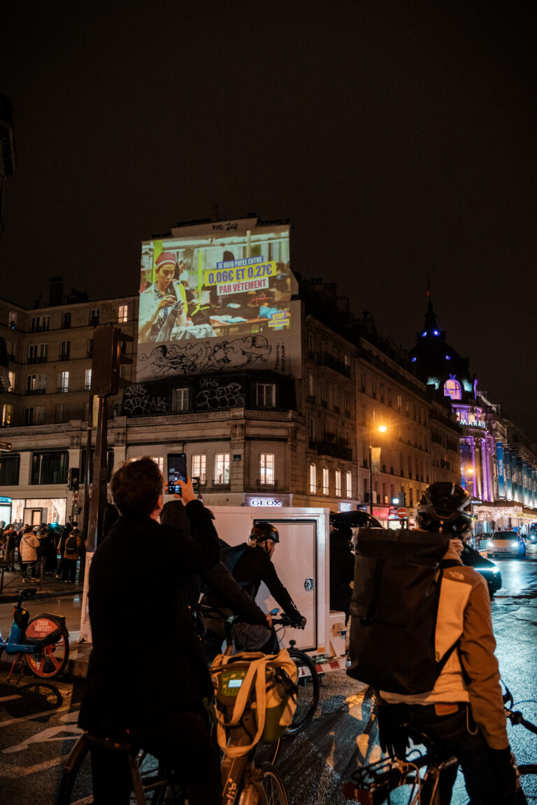 Stop fast-fashion ont organisé des projections sur des façades de bâtiments parisiens. Rue de Rivoli, opéra Bastille, rue Réaumur, Trocadéro… Les lieux choisis, emblématiques et très passants, ont permis de faire passer des messages forts comme « Je travaille 75h/semaine », « J’ai commencé à travailler à 12 ans », « Je suis payée entre 0,06€ et 0,27€ par vêtement », « Je suis exposée à des produits toxiques », ou encore « J’ai survécu à l’effondrement du Rana Plaza ».