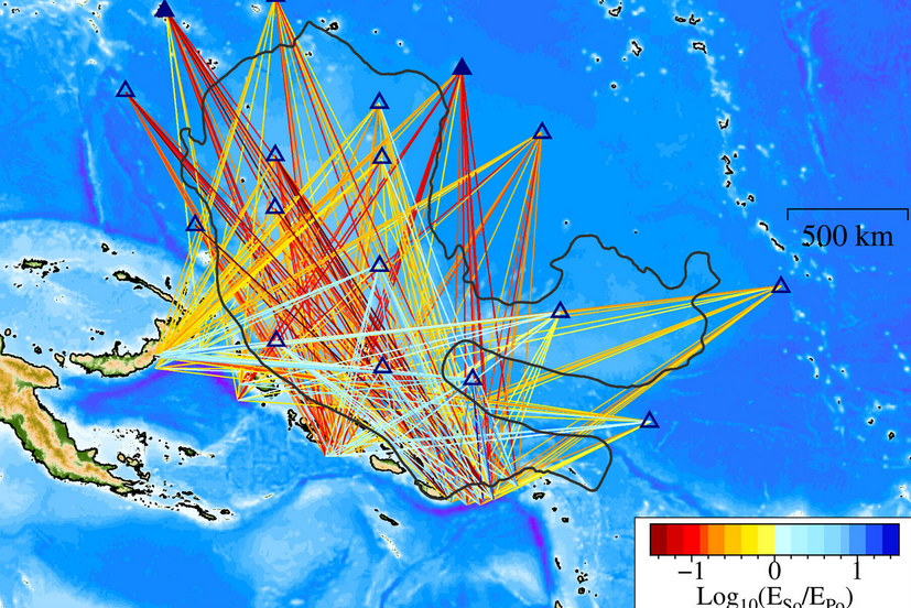 photo: Map showing the Ontong Java Plateau (OJP) and ray paths of Po and So waves. The outline of the OJP (Coffin et al., 2006) is represented by a black line. Colored lines indicate ray paths of the Po and So waves observed in the OJP. The color scale indicates the energy of So waves relative to Po waves (ESo/EPo). Open and solid triangles indicate ocean bottom seismic stations and island seismic stations, respectively. Credit: Geophysical Research Letters (2025). DOI: 10.1029/2025gl115219