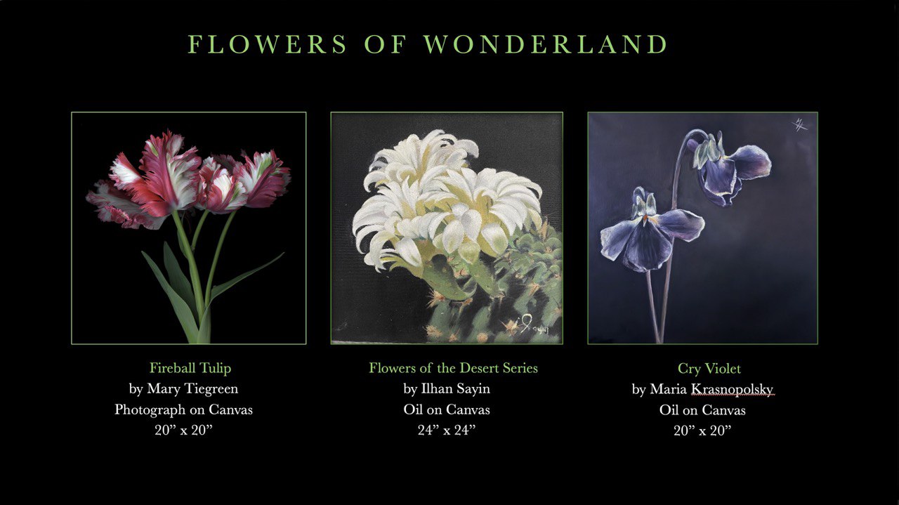 The Flowers of Wonderland Flag features the work of oil artists Maria Kranspolsky (Eulogy of Flora Series), Ihan Sayin (Flowers of the Desert and Flowers of Hope Series) and photographer and AI artist Mary Tiegreen (Wonderland Series) to draw attention to the vital role of flowers in human well-being, traditional knowledge, and sustainable economies. As flowers are vital for human well-being by reducing stress and improving mental health. They support traditional knowledge through indigenous ceremonies and cultural rituals and drive sustainable economies via the booming eco-friendly floral industry, pollination-dependent agriculture, and environmental services like pollution control and pollinator habitat.