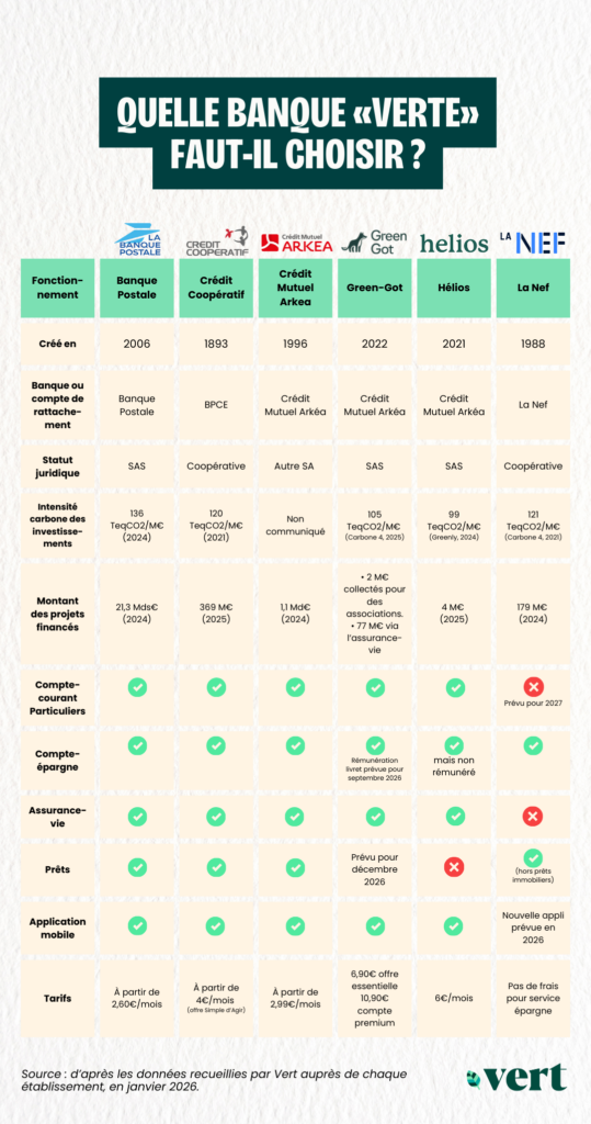 Plusieurs banques traditionnelles font figure de bonnes élèves. La Banque Postale, et sa filiale Ma French Bank, a pris en 2021 et 2022 de forts engagements pour stopper totalement les financements du secteur fossile en 2030. Elle soutient par ailleurs des secteurs clés de la transition écologique et affirme avoir financé, entre 2017 et 2025, 4,6 milliards d’euros pour des projets de production d’énergies renouvelables.